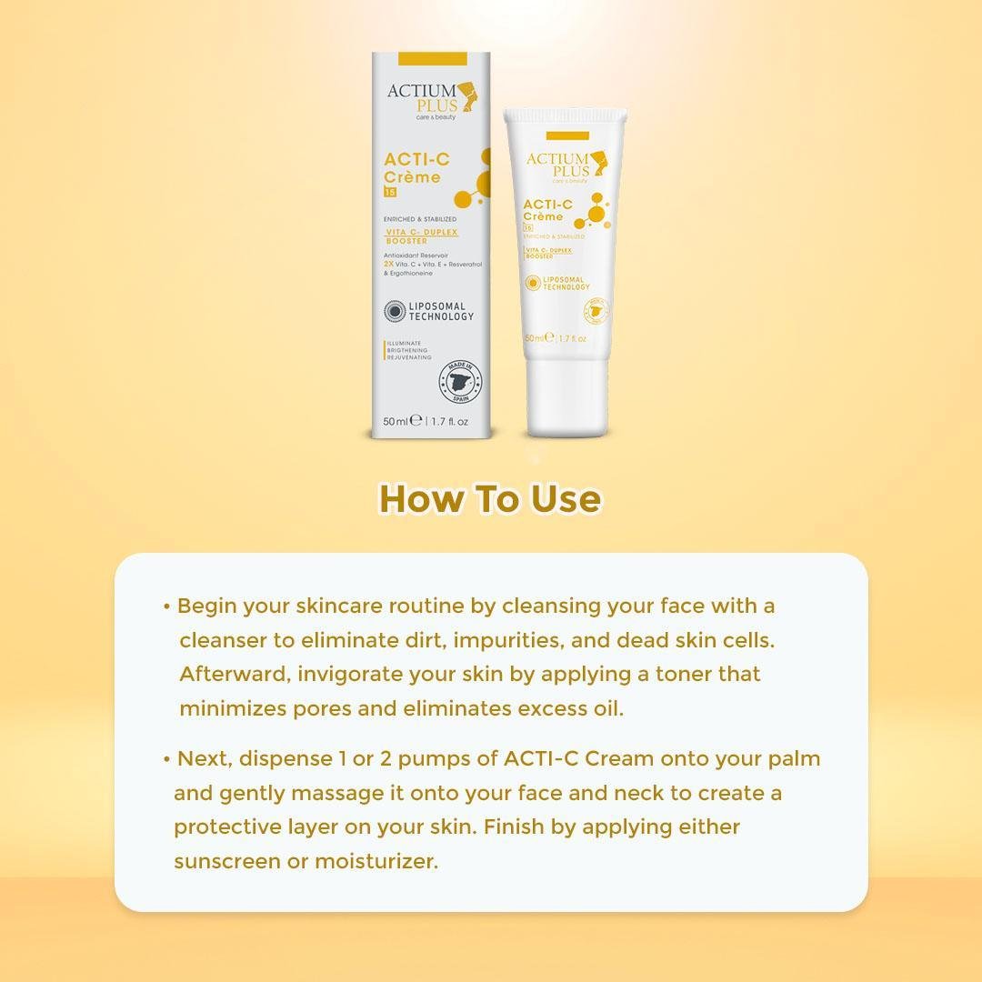 • Take 1 or 2 pump of ACTI C Cream on your palm and rub gently on your face and neck area to develop layers on skin and followed with Sunscreen or Moisturizer.